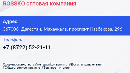 ROSSKO, оптовая компания по адресу 367006, Дагестан, Махачкала, проспект Казбекова, 296 в дальнейшем Организация, размещена в следующих категориях: