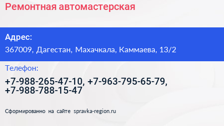 Ремонтная автомастерская по адресу 367009, Дагестан, Махачкала, Каммаева, 13/2 в дальнейшем Организация, размещена в следующих категориях:
