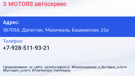 S-MOTORS, автосервис по адресу 367018, Дагестан, Махачкала, Башкирская, 21а в дальнейшем Организация, размещена в следующих категориях: