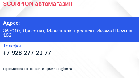 SCORPION, автомагазин по адресу 367010, Дагестан, Махачкала, проспект Имама Шамиля, 182 в дальнейшем Организация, размещена в следующих категориях: