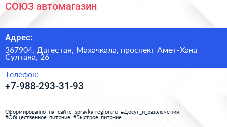СОЮЗ, автомагазин по адресу 367904, Дагестан, Махачкала, проспект Амет-Хана Султана, 26 в дальнейшем Организация, размещена в следующих категориях: