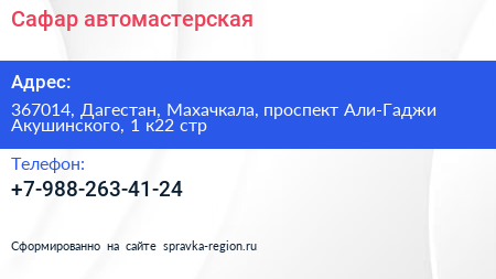Сафар, автомастерская по адресу 367014, Дагестан, Махачкала, проспект Али-Гаджи Акушинского, 1 к22 стр в дальнейшем Организация, размещена в следующих категориях: