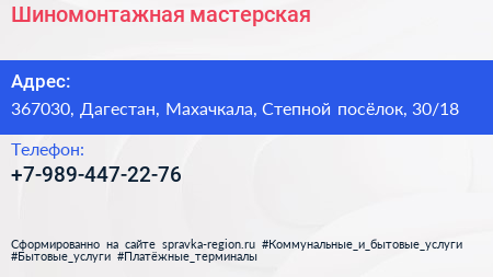 Шиномонтажная мастерская по адресу 367030, Дагестан, Махачкала, Степной посёлок, 30/18 в дальнейшем Организация, размещена в следующих категориях: