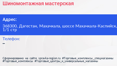 Шиномонтажная мастерская по адресу 368300, Дагестан, Махачкала, шоссе Махачкала-Каспийск, 1/1 стр в дальнейшем Организация, размещена в следующих категориях: