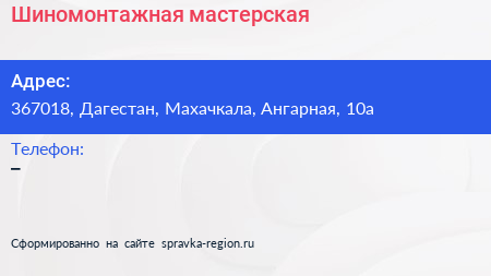 Шиномонтажная мастерская по адресу 367018, Дагестан, Махачкала, Ангарная, 10а в дальнейшем Организация, размещена в следующих категориях: