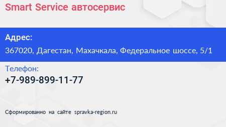 Smart Service, автосервис по адресу 367020, Дагестан, Махачкала, Федеральное шоссе, 5/1 в дальнейшем Организация, размещена в следующих категориях: