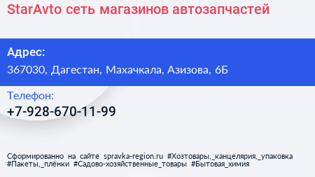 StarAvto, сеть магазинов автозапчастей по адресу 367030, Дагестан, Махачкала, Азизова, 6Б в дальнейшем Организация, размещена в следующих категориях: