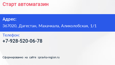 Старт, автомагазин по адресу 367020, Дагестан, Махачкала, Аликолобская, 1/1 в дальнейшем Организация, размещена в следующих категориях: