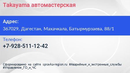 Takayama, автомастерская по адресу 367029, Дагестан, Махачкала, Батырмурзаева, 88/1 в дальнейшем Организация, размещена в следующих категориях: