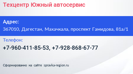 Техцентр Южный, автосервис по адресу 367010, Дагестан, Махачкала, проспект Гамидова, 81а/1 в дальнейшем Организация, размещена в следующих категориях:
