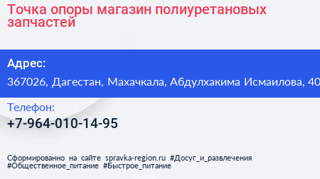 Точка опоры, магазин полиуретановых запчастей по адресу 367026, Дагестан, Махачкала, Абдулхакима Исмаилова, 40 в дальнейшем Организация, размещена в следующих категориях: