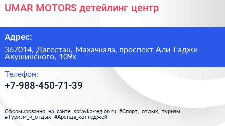 UMAR MOTORS, детейлинг центр по адресу 367014, Дагестан, Махачкала, проспект Али-Гаджи Акушинского, 109к в дальнейшем Организация, размещена в следующих категориях: