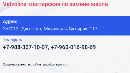 Valvoline, мастерская по замене масла по адресу 367013, Дагестан, Махачкала, Батырая, 117 в дальнейшем Организация, размещена в следующих категориях: