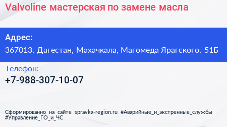 Valvoline, мастерская по замене масла по адресу 367013, Дагестан, Махачкала, Магомеда Ярагского, 51Б в дальнейшем Организация, размещена в следующих категориях:
