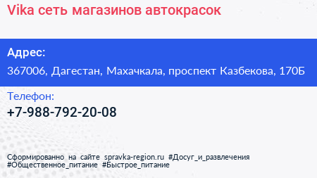 Vika, сеть магазинов автокрасок по адресу 367006, Дагестан, Махачкала, проспект Казбекова, 170Б в дальнейшем Организация, размещена в следующих категориях: