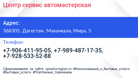 Центр-сервис, автомастерская по адресу 368305, Дагестан, Махачкала, Мира, 5 в дальнейшем Организация, размещена в следующих категориях: