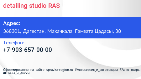 detailing studio RAS по адресу 368301, Дагестан, Махачкала, Гамзата Цадасы, 38 в дальнейшем Организация, размещена в следующих категориях: