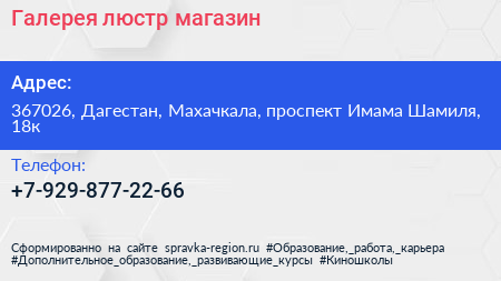 Галерея люстр, магазин по адресу 367026, Дагестан, Махачкала, проспект Имама Шамиля, 18к в дальнейшем Организация, размещена в следующих категориях: