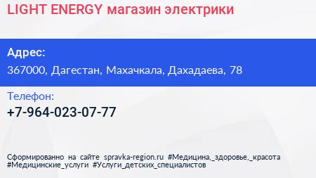 LIGHT ENERGY, магазин электрики по адресу 367000, Дагестан, Махачкала, Дахадаева, 78 в дальнейшем Организация, размещена в следующих категориях: