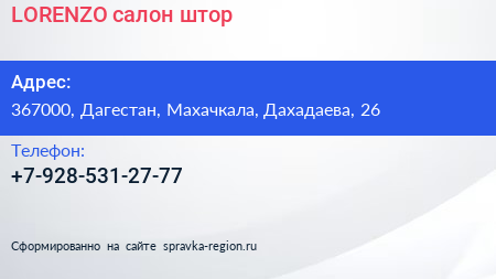 LORENZO, салон штор по адресу 367000, Дагестан, Махачкала, Дахадаева, 26 в дальнейшем Организация, размещена в следующих категориях: