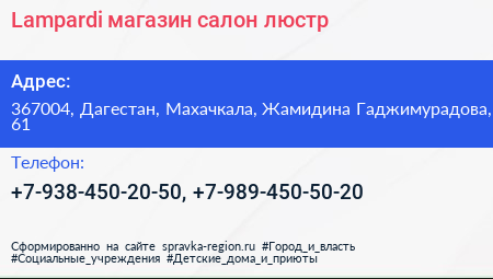 Lampardi, магазин-салон люстр по адресу 367004, Дагестан, Махачкала, Жамидина Гаджимурадова, 61 в дальнейшем Организация, размещена в следующих категориях:
