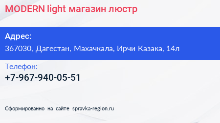 MODERN light, магазин люстр по адресу 367030, Дагестан, Махачкала, Ирчи Казака, 14л в дальнейшем Организация, размещена в следующих категориях: