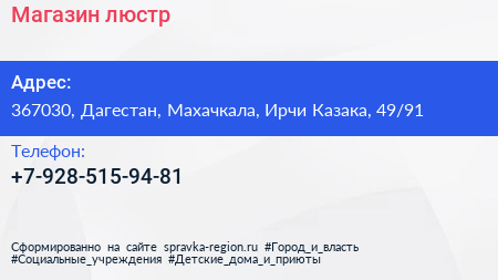 Магазин люстр по адресу 367030, Дагестан, Махачкала, Ирчи Казака, 49/91 в дальнейшем Организация, размещена в следующих категориях: