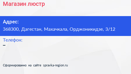 Магазин люстр по адресу 368300, Дагестан, Махачкала, Орджоникидзе, 3/12 в дальнейшем Организация, размещена в следующих категориях: