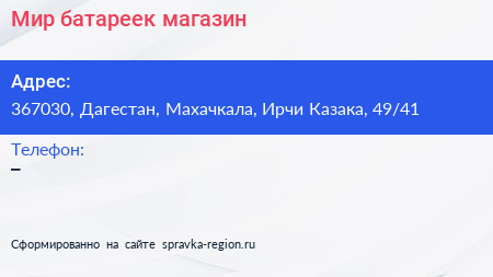 Мир батареек, магазин по адресу 367030, Дагестан, Махачкала, Ирчи Казака, 49/41 в дальнейшем Организация, размещена в следующих категориях: