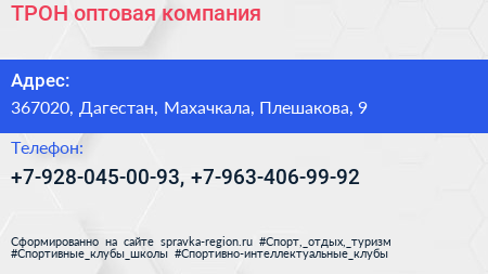 ТРОН, оптовая компания по адресу 367020, Дагестан, Махачкала, Плешакова, 9 в дальнейшем Организация, размещена в следующих категориях: