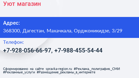 Уют, магазин по адресу 368300, Дагестан, Махачкала, Орджоникидзе, 3/29 в дальнейшем Организация, размещена в следующих категориях: