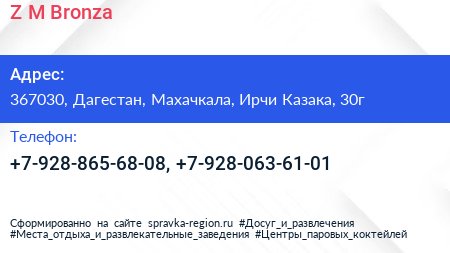 Z M Bronza по адресу 367030, Дагестан, Махачкала, Ирчи Казака, 30г в дальнейшем Организация, размещена в следующих категориях:
