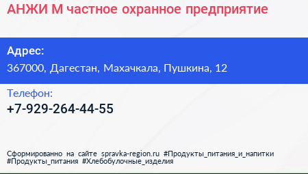 АНЖИ-М, частное охранное предприятие по адресу 367000, Дагестан, Махачкала, Пушкина, 12 в дальнейшем Организация, размещена в следующих категориях: