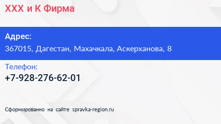 ХХХ и К, Фирма по адресу 367015, Дагестан, Махачкала, Аскерханова, 8 в дальнейшем Организация, размещена в следующих категориях: