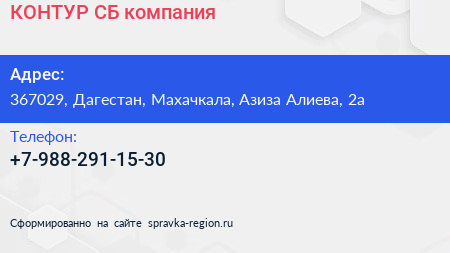 КОНТУР СБ, компания по адресу 367029, Дагестан, Махачкала, Азиза Алиева, 2а в дальнейшем Организация, размещена в следующих категориях: