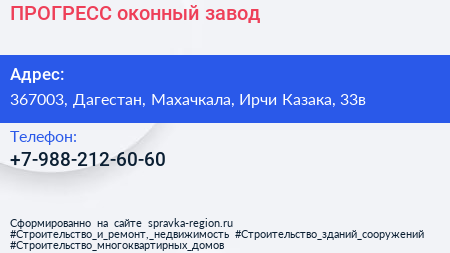 ПРОГРЕСС, оконный завод по адресу 367003, Дагестан, Махачкала, Ирчи Казака, 33в в дальнейшем Организация, размещена в следующих категориях: