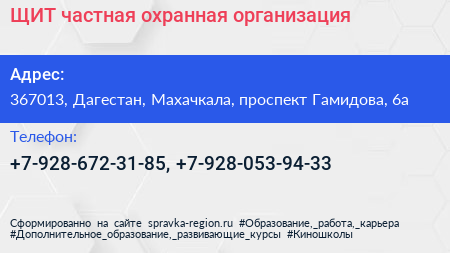 ЩИТ, частная охранная организация по адресу 367013, Дагестан, Махачкала, проспект Гамидова, 6а в дальнейшем Организация, размещена в следующих категориях: