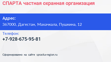 СПАРТА, частная охранная организация по адресу 367000, Дагестан, Махачкала, Пушкина, 12 в дальнейшем Организация, размещена в следующих категориях: