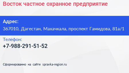 Восток, частное охранное предприятие по адресу 367010, Дагестан, Махачкала, проспект Гамидова, 81а/1 в дальнейшем Организация, размещена в следующих категориях:
