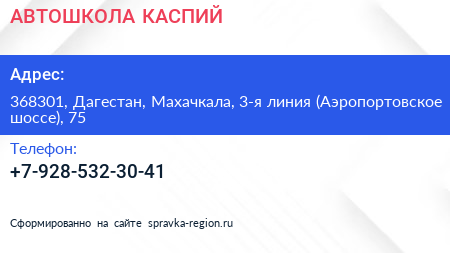 АВТОШКОЛА КАСПИЙ по адресу 368301, Дагестан, Махачкала, 3-я линия (Аэропортовское шоссе), 75 в дальнейшем Организация, размещена в следующих категориях: