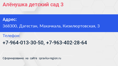 Алёнушка, детский сад №3 по адресу 368300, Дагестан, Махачкала, Кизилюртовская, 3 в дальнейшем Организация, размещена в следующих категориях: