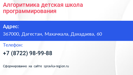 Алгоритмика, детская школа программирования по адресу 367000, Дагестан, Махачкала, Дахадаева, 60 в дальнейшем Организация, размещена в следующих категориях: