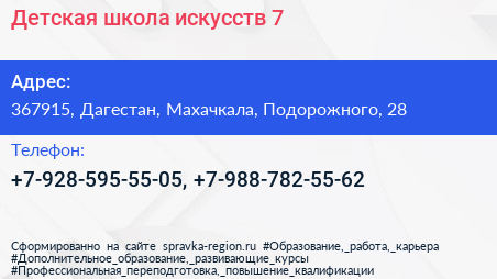 Детская школа искусств №7 по адресу 367915, Дагестан, Махачкала, Подорожного, 28 в дальнейшем Организация, размещена в следующих категориях: