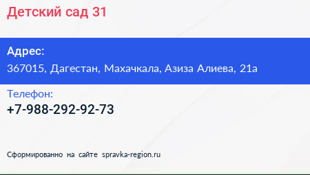 Детский сад №31 по адресу 367015, Дагестан, Махачкала, Азиза Алиева, 21а в дальнейшем Организация, размещена в следующих категориях: