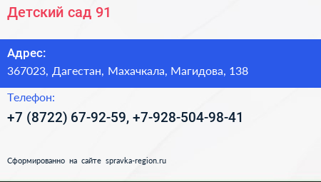Детский сад №91 по адресу 367023, Дагестан, Махачкала, Магидова, 138 в дальнейшем Организация, размещена в следующих категориях: