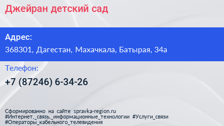 Джейран, детский сад по адресу 368301, Дагестан, Махачкала, Батырая, 34а в дальнейшем Организация, размещена в следующих категориях: