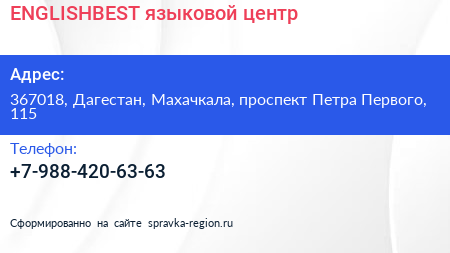 ENGLISHBEST, языковой центр по адресу 367018, Дагестан, Махачкала, проспект Петра Первого, 115 в дальнейшем Организация, размещена в следующих категориях: