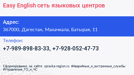 Easy English, сеть языковых центров по адресу 367000, Дагестан, Махачкала, Батырая, 11 в дальнейшем Организация, размещена в следующих категориях: