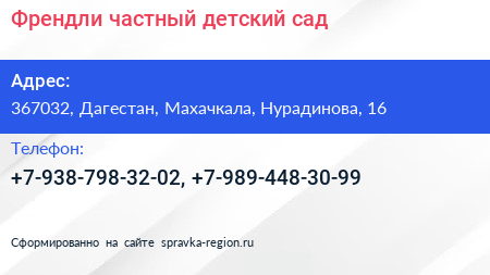 Френдли, частный детский сад по адресу 367032, Дагестан, Махачкала, Нурадинова, 16 в дальнейшем Организация, размещена в следующих категориях: