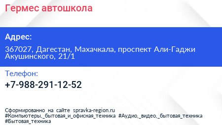 Гермес, автошкола по адресу 367027, Дагестан, Махачкала, проспект Али-Гаджи Акушинского, 21/1 в дальнейшем Организация, размещена в следующих категориях: